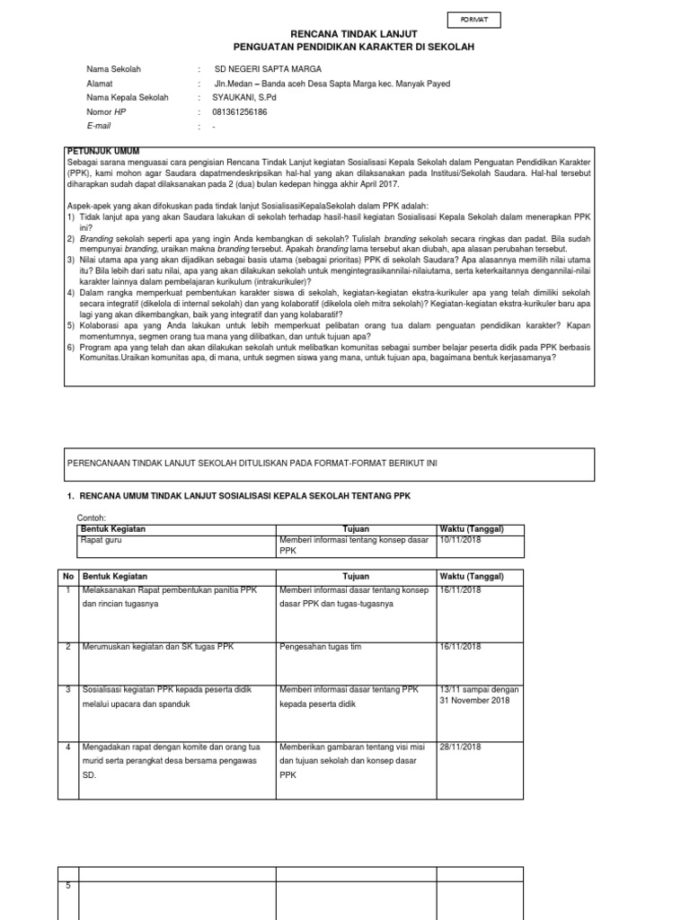 Rencana pengembangan sekolah Contoh Program Kerja Tahunan Kepala Sekolah SDSMSMA Terbaru 20172018doc Contoh Penyerahan Jabatan SERTIJAB Kepala Sekolah Lainnya. OJL Penguatan Kepala Sekolah 5 18 445 Contoh Laporan OJL Kepala Sekolah Terbaru 2017 Kata Pengantar 2 18 640 PWR POIN TUGAS dan PERAN KEPALA SEKOLAH 60 1 2 PEMBAHASAN KELOMPOK 3 3 3 14 20. Keterangan Kolom keterangan diisi dengan kegiatan pendampingan OJL serta In-Service Learning 2 oleh peserta penguatan kemampuan kepala sekolah madrasah.