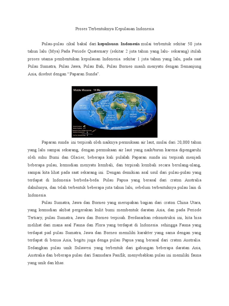 Pulau-pulau cikal bakal dari kepulauan Indonesia mulai terbentuk sekitar 50 juta tahun lalu MyaPada Periode Quaternary sekitar 2 juta tahun yang lalu- sekarang itulah proses utama pembentukan kepulauan Indonesia. MASA PANGEA DAN TERBENTUKNYA KEPULAUAN INDONESIA MAKALAH diajukan untuk memenuhi salah satu tugas mata kuliah Evolusi yang diampu oleh Prof. Oleh dosenpendidikan Diposting pada 05122020.