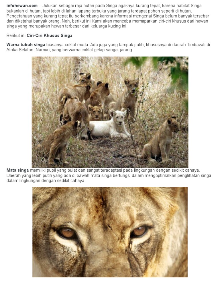 Namun singa jantan cukup bijak dan tidaklah rakus dan hanya mengambil sebagian daging saja dan sebagian besar daging buruan tersebut tetaplah milik kelompoknya. Hewan atau umum disebut dengan binatang mayoritas mempunyai ciri khusus beserta fungsinya masing-masing. Ciri Khusus Pada Singa.
