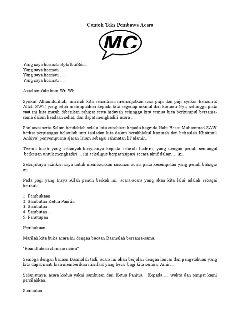 Marilah sejenak kita bersama-sama menundukkan kepala bermunajat kepada Tuhan agar kegiatan kita hari ini diberkahi dan bisa berjalan dengan lancar. Contoh Teks MC atau Teks Pembawa Acara MC atau master ceremony merupakan seseorang yang memimpin jalannya sebuah acara baik itu acara formal maupun acara non formal. Untuk pembahasan terlengkapnya dapat sobat simak artikel berikut dibawah ini.