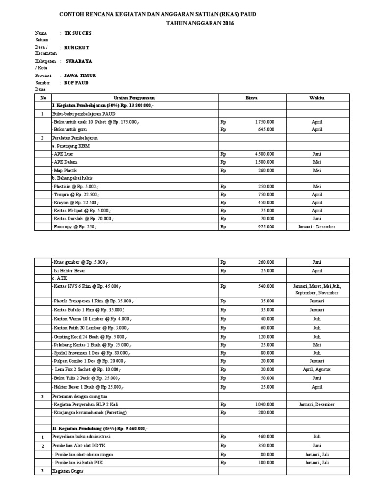Contoh RKAS TKPAUD Tahun Anggaran 2017. DAK NON FISIK Kabupaten Tahun Anggaran 2017 No Uraian Kegiatan Biaya Waktu. 20142015 Nama Sekolah.
