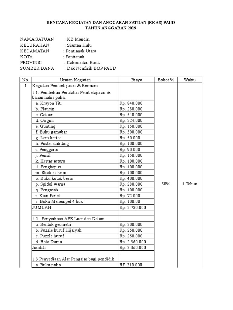 Contoh rkas tk. Kode Uraian Urut Belanja Jumlah Tw. Demikian yang bisa kami sampaikan mengenai keterangan berkas dan share file Contoh RKAS BOP PAUD TerbaruSemoga bisa bermanfaat. Juknis BOP PAUD untuk Anak Berkebutuhan Khusus Tahun 2019.