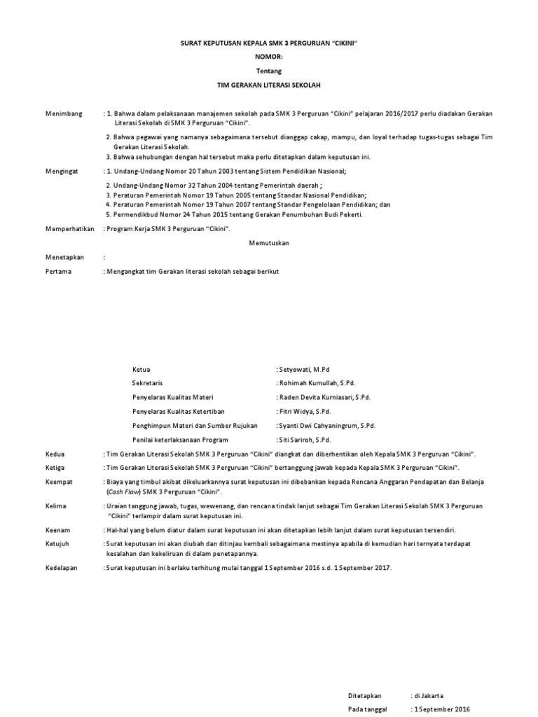 Biaya yang timbul akibat dikeluarkannya surat keputusan ini dibebankan pada anggaran sekolah yang sesuai. Mar 21 2019 Download Contoh SK Pembentukan Tim Gerakan Literasi Sekolah Tingkat Sekolah Dasar SD Tahun 2019 SK Tim Literasi Sekolah untuk SMK Contoh - SMKS NU Balikpapan Apr 11 2019 1. Untuk itu pada bagian akhir artikel ini kami bagikan contoh SK Tim Literasi Sekolah dengan tujuan mempermudah BapakIbu yang membutuhkan.