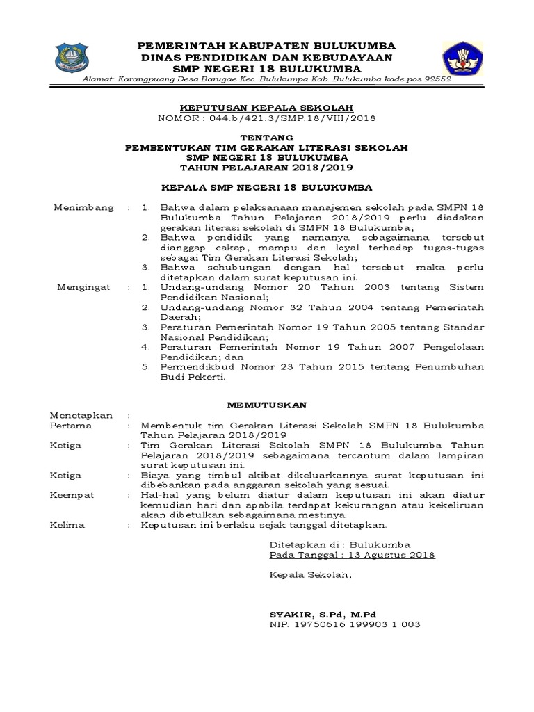 Sk tim gerakan literasi sekolah. Baiklah berikut ini contoh sk tim literasi sekolah. SK Tim Literasi Sekolahdoc. Tim Gerakan Literasi Sekolah SMPN 18 Bulukumba Tahun Pelajaran 20182019 sebagaimana tercantum dalam lampiran surat keputusan ini.
