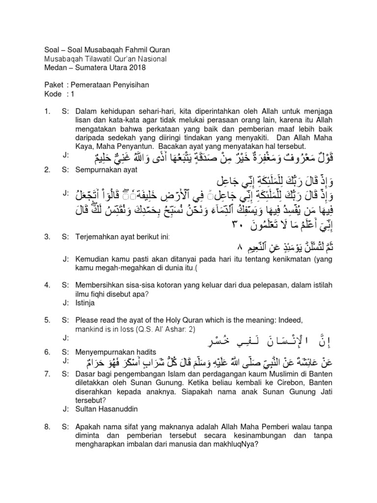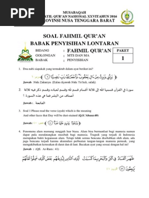 Download soal fahmil quran 2018 pdf. 20190928 PDF Ebook ini menceritakan berbagai keajaiban yang dialami penulis sebagai praktisi Fahmil Quran sejak tahun 1993 sampai dengan sekarang. MUSABAQAH TILAWATIL QURAN NASIONAL XXVITAHUN 2016 DI PROVINSI NUSA TENGGARA BARAT SOAL FAHMIL QURAN BABAK PENYISIHAN LONTARAN BIDANG. MTS DAN MA 1 BABAK.